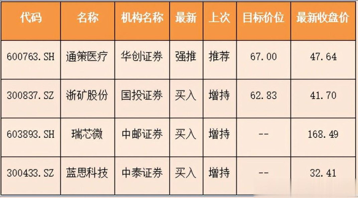 近5日有4家公司得回券商调高评级,其中浙矿股份、通策医疗得回明确主见价位。